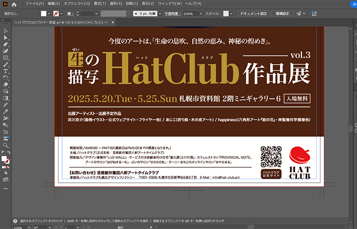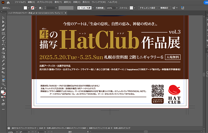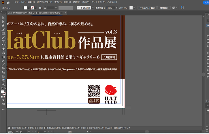 JAN 08 2025 創作日誌 フライヤー制作、最終回。 ブログを御覧の皆様、いかがお過ごしでしょうか? リーダーの灰川です。 さて、フライヤー制作も最終段階に入り、QRコードも載せたので、後は協力団体等諸々の文字を載せていきます。 ↑ で、当クラブの縦ロゴを載せて… ↑ で、開催時間等を載せて、区切り線を入れて… ↑ 最後に問い合わせ先を入れて、無事に完成でございます。 この後は文字が全てアウトライン化されているか、余計なオブジェクトが混ざっていないか等のデータチェックを行ってから印刷会社にデータを引き渡すという過程になる訳です。 というわけで、これでフライヤー表面は完成。裏も同様のノリで作ってますので、後は実物をお手に取って確かめていただければ。 それでは、また。 Post Share Hatena LINE RSS feedly Pin it note 投稿者: Kyosuke Haikawa創作日誌 謹賀新年。 今度は裏面。