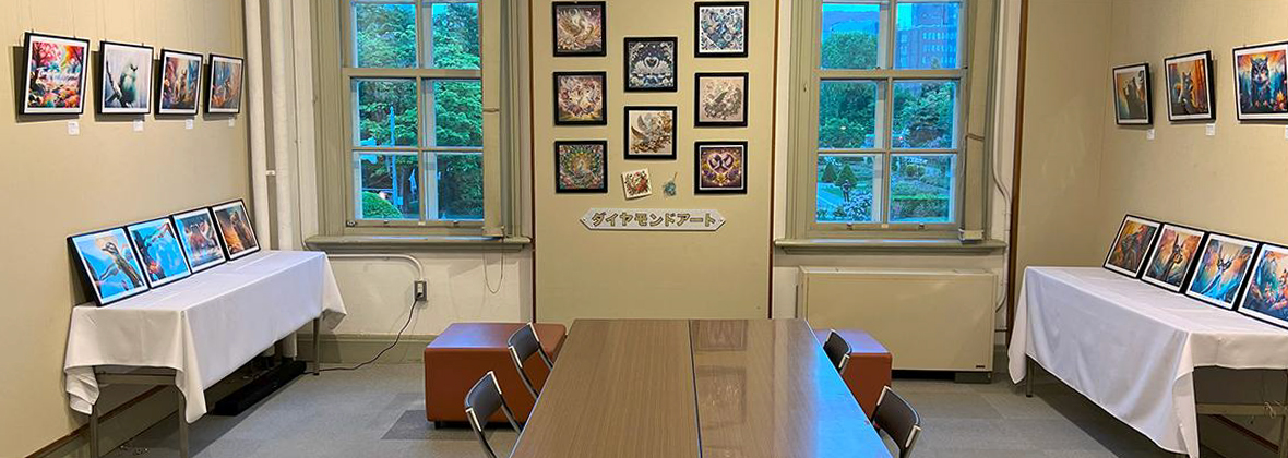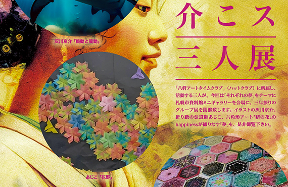 こうして2020年に産声を上げた「八軒アートタイムクラブ」。ただ、作品展をするべくクラブを結成してはみたものの、作品展示の場として、そしてミーティングの場としても普段から利用していた「カフェまろん」は既に閉店、このコロナ禍で貸してくれるギャラリーもほぼ無い状態。そこで灰川が「オンライン作品展をやろう!」と言いだし、作品展の為だけに急遽Webサイトを猛スピードで制作、そこにhappinessとあじこも作品画像をメールで送ってサイトに掲載、無事にオンライン作品展開催に漕ぎ着けたのであった。そして暫く活動を休止していたが2023年秋、灰川がまたもhappinessとあじこに呼びかけて再始動、2024年5月下旬、札幌市資料館にて作品展を開催。今後も三人各自のソロ活動もあるため、年1回のスローペースではあるが創作活動をして、必ず札幌市資料館で作品展示をしよう、ということになったのである。