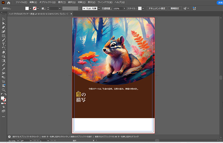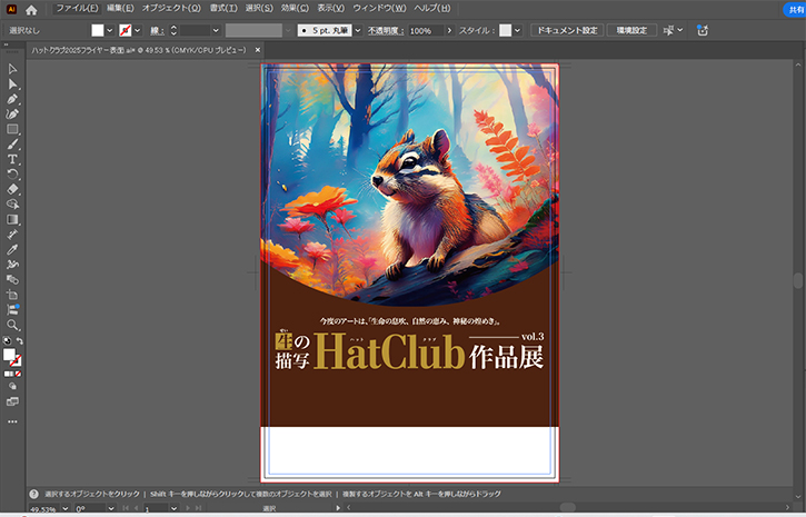 DEC 12 2024 創作日誌 フライヤー制作Part3。 さて、ブログを御覧の皆様、如何お過ごしでしょうか? ハットクラブリーダーの灰川です。 もう少し続きます、フライヤー制作記録。 Part1で土台を作り、Part2で長方形を二つ敷いて画像を載せました。 Part3では文字要素を入れていく過程を、簡単にですがお見せしたいと思います。 で、キャッチコピーを投入。 文字サイズは20Q、フォントは「ヒラギノ明朝 W6」を使用。 ま、基本おいら、自分で自分向けの制作を行う場合、明朝体もゴシック体もヒラギノしか使いません。Apple製品の影響によるところが大きいんですがwww タイトル左側。 「生」の文字は、意図的に少し右にずらして、敢えて「パスファインダ」で抜いてます。 重ねたままでも良かったんですが。 で、タイトルの右側を制作。 英語にとっつきにくい方の為に、団体名にカタカナでフリガナをさりげなく入れておくのがミソ、だったりします。 取り敢えず今回はここまで。 それでは、また。 Post Share Hatena LINE RSS feedly Pin it note 投稿者: Kyosuke Haikawa創作日誌 フライヤー制作Part2。 フライヤー制作Part4。
