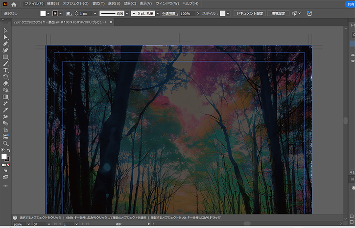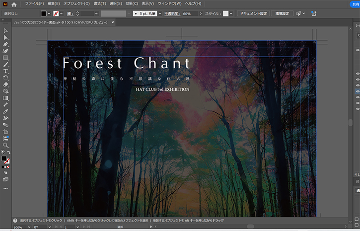 JAN 16 2025 創作日誌 今度は裏面。 ブログを御覧の皆様、いかがお過ごしでしょうか? リーダーの灰川です。 さて、表面のデザイン制作が終わったところで、今度は裏面デザインに入ります。 で、まずはトリムマークとガイドを入れて、背景を載っける。 白文字を使いたかったので、不透明30%程度の黒の長方形も。 で、作品展のタイトルを載せる。 今回は美しさ・エレガントさも表現したかったので、柄にも合わず”Optimaフォント”を使用。 ということで、今回はここまで。 それでは、また。 Post Share Hatena LINE RSS feedly Pin it note 投稿者: Kyosuke Haikawa創作日誌 フライヤー制作、最終回。 ウェルカムポスター、完成。