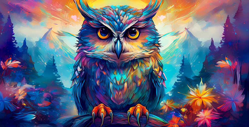 羽には現実には存在しない色彩を大胆に重ね、紫・青・橙といった色のグラデーションで命の躍動感とスピリチュアルな輝きを表現。背景の山々や森、そして舞い踊るように咲く花々も加えることにより、まるでこの幻想的かつ鮮やかな色彩のシマフクロウが森の魂そのものである、との思いを込めています。