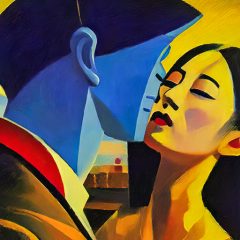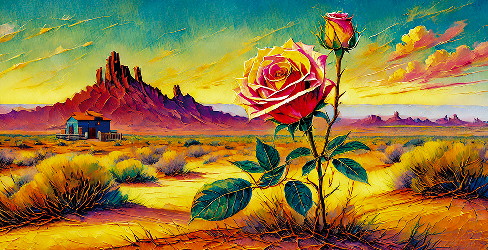 - ある日見た夢。テキサスの荒野のド真ん中。遠くに見えるはバーと思しき古びた建物。建物から出て来たカップルがこちらに歩いて来る内に、段々と薔薇に姿を変えていき、最後はしっかりと地面に根を張った二つに一つの薔薇になってしまった、という夢をイラスト化。
