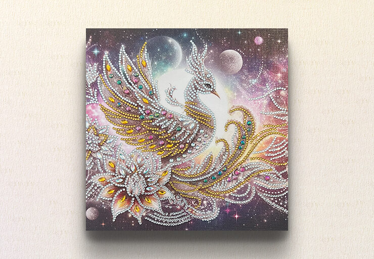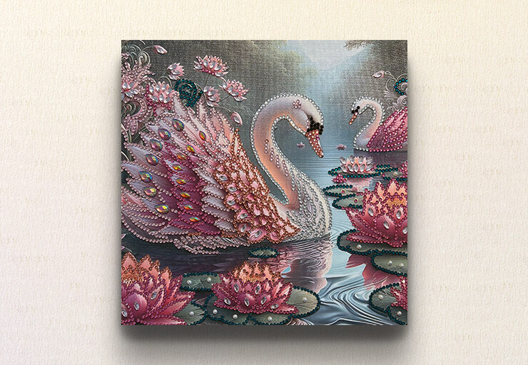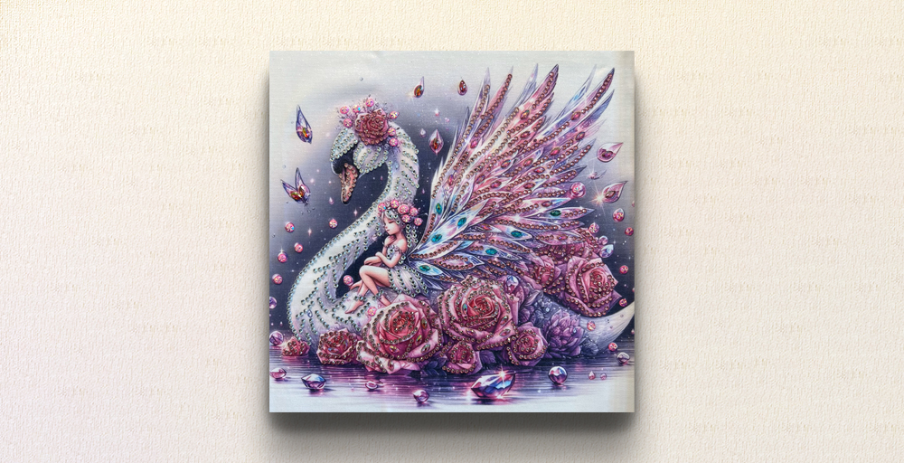 - この作品は、幻想世界の湖畔に佇む白鳥と妖精の絆を描いたダイヤモンドアートです。大輪の薔薇に囲まれた白鳥は、まるで神聖な守護者のように妖精を優しく包み込み、その羽には無数の輝石がちりばめられています。翼のひとつひとつが夢と希望を宿し、見る人の心を非日常の世界へと誘います。