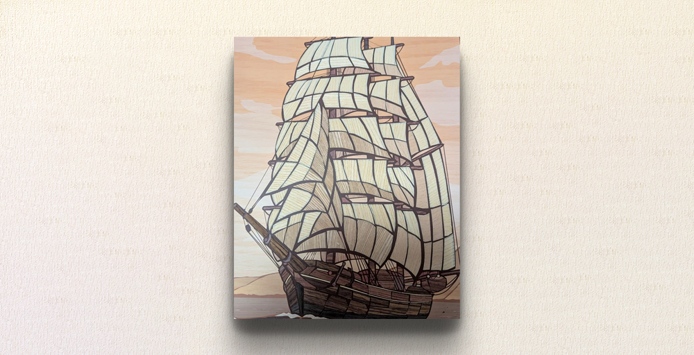 - この作品は、木の皮を用いて一隻の帆船を緻密に描き出した作品です。複数の種類の木の皮が持つ自然な色合いや木目の違いを巧みに活かすことで、帆や船体の立体感や質感が見事に表現しました。帆に風をはらませ、力強くも優雅で、静かな海と穏やかな空を背景に、旅立ちの瞬間を感じさせるよう工夫しています。