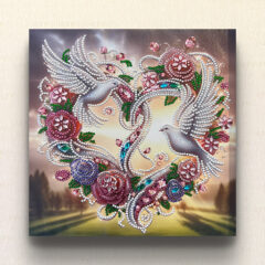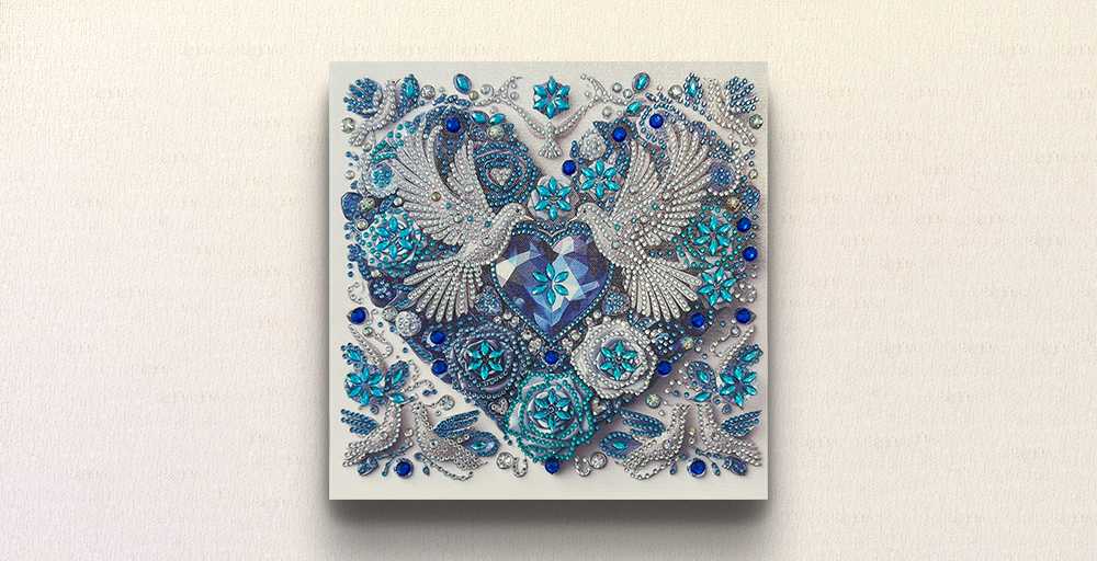 - 本作は、澄みきった氷のような青で彩られたハートと、それを包みこむように羽ばたく二羽の鳥が、静かに響きあう心の結びつきを描いたダイヤモンドアート作品です。中心にはカットされた宝石のようなハートモチーフが配置され、その周囲には雪の結晶のような花々と星が輝き、まるで凍てついた美の世界に迷い込んだかのような幻想空間を演出しています。