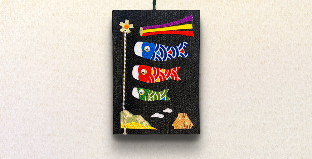 現代ちりめんあじこ2025年 風薫る節句 作品解説 黒地に鮮やかな「鯉のぼり」と「吹き流し」を描き、端午の節句を象徴するモチーフを美しく表現しました。 happiness 煌めく瑞鳥(ずいちょう) あじこ おばけ日和