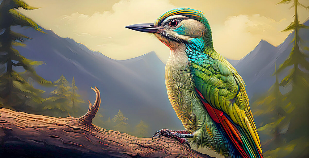 - この作品は、北海道に生息する美しいキツツキの一種「ヤマゲラ」を主役に、朝靄に包まれた山岳の森を背景に描いた幻想的な一枚。羽根に広がるエメラルドグリーンやターコイズブルー、そして胸元の柔らかなグレーが自然と調和し、まるで森そのものから生まれたかのような一体感を表現しました。