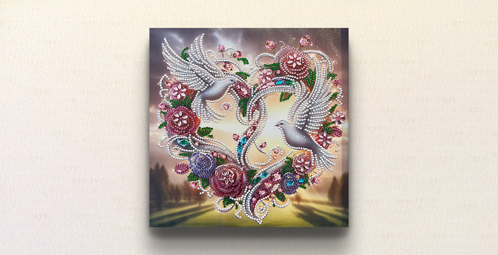 - 本作は、朝の柔らかな光に包まれながら舞う二羽の鳥が、花々とともに美しいハート型を織りなす、希望と祝福に満ちたダイヤモンドアート作品です。鳥たちは互いに向かい合い、繊細な羽を広げながら、まるで空中で踊るように調和を奏でています。