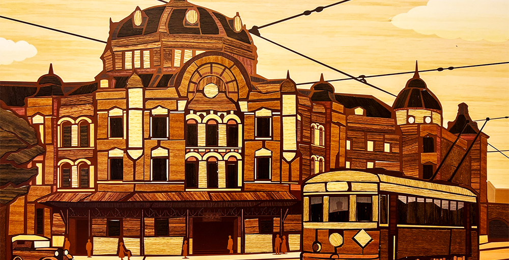 木の皮アートあじこ2025年 時を刻む駅舎 作品解説 歴史的な駅舎と路面電車、そしてクラシックカーを木の皮で丁寧に表現し、まるで過去の都市の一瞬を切り取ったかのような趣が出るように仕上げました。また、作品タイトルの「時を刻む」という表現で、建物が街と共に歴史を見守ってきた存在であることも表現しています。作品モデルは誰もが知っている、東京都のJR東京駅です。 あじこ 木霊の里 あじこ 夕映えの天守