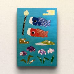 現代ちりめんあじこ2025年 雛の雅 作品解説 華やかな衣装をまとったお内裏様とお雛様を並べて立てて、背景には扇と梅の花をあしらい、雛祭りらしい優美な意匠になるよう制作しました。 あじこ 瑞気満つ あじこ 空翔ける祝い