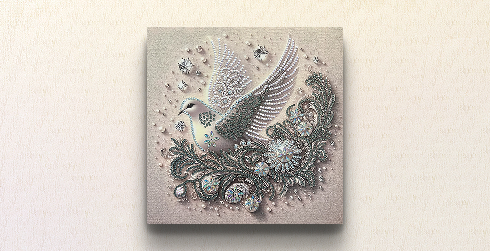 - この作品は、純白に輝く一羽の鳥が静かに羽ばたく姿を、パールやビーズの煌めきで描き出したダイヤモンドアート作品です。柔らかなベージュトーンの背景に浮かぶその姿は、まるで時を止めた静寂の中で祈りを捧げるような美しさをたたえています。