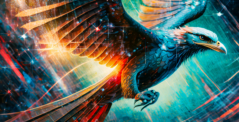- 「夢の世界」を旅して回る為に、和装の女神様が自分に遣わせた聖なる鳥。星々と光が交錯する夢の世界の入口を力強く飛翔する、宇宙の炎をまとった神秘的な姿を、何回も何回も描き直した末に誕生した一枚。